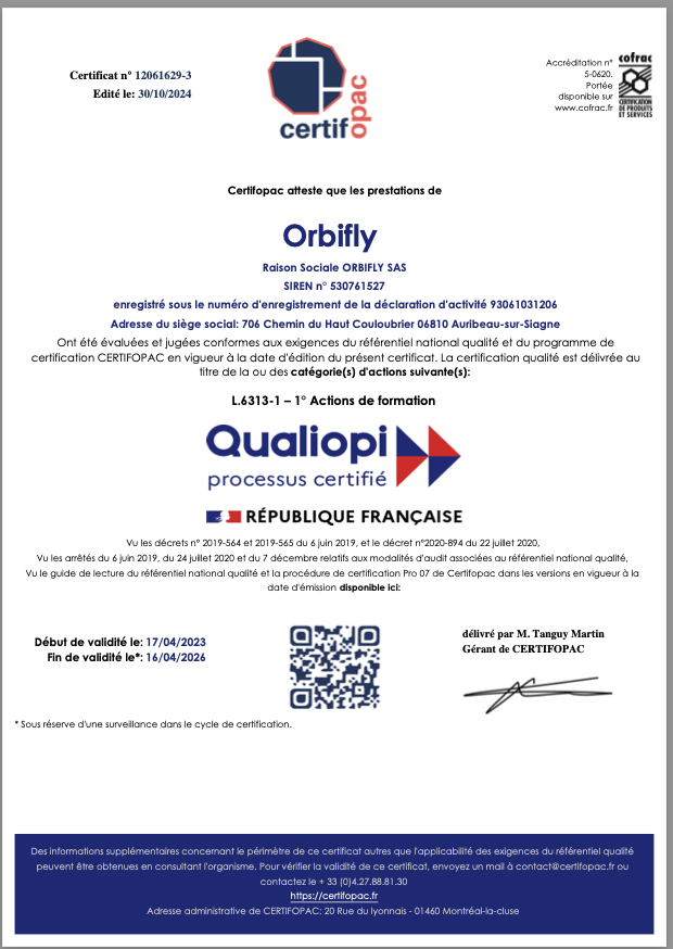 Orbifly dispose de la certification QUALIOPI pour les actions de formation.